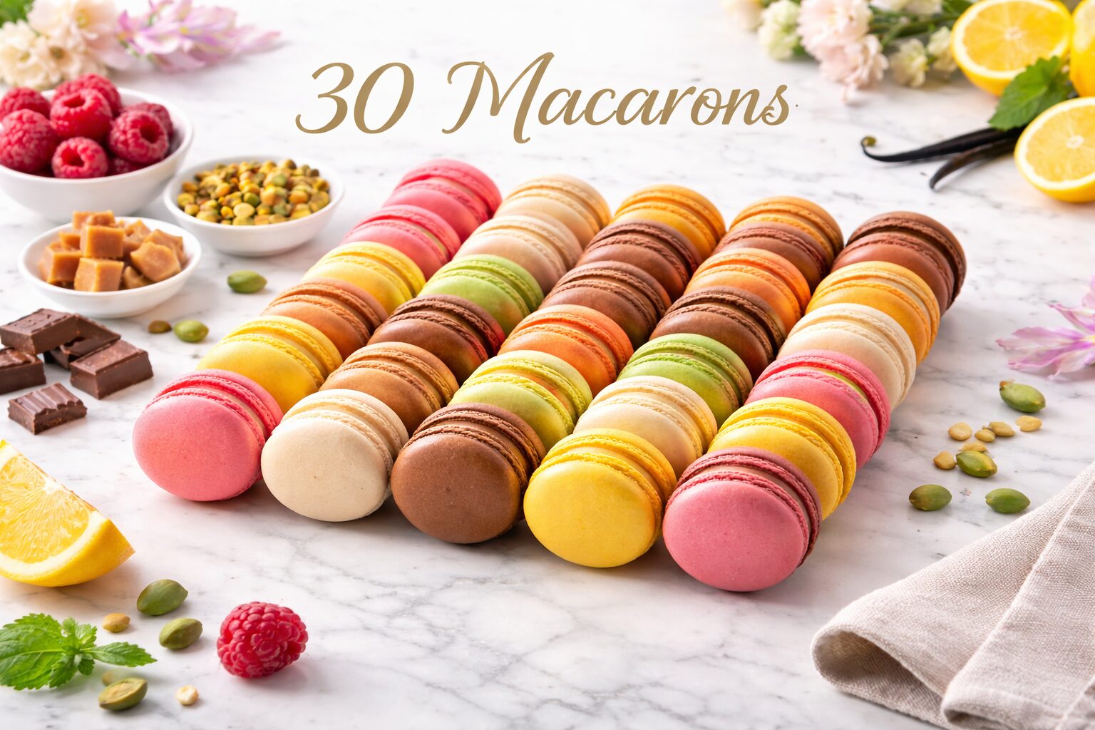 30 macarons Deluxe – un assortiment genereux de macarons artisanaux presentes dans notre packaging premium.