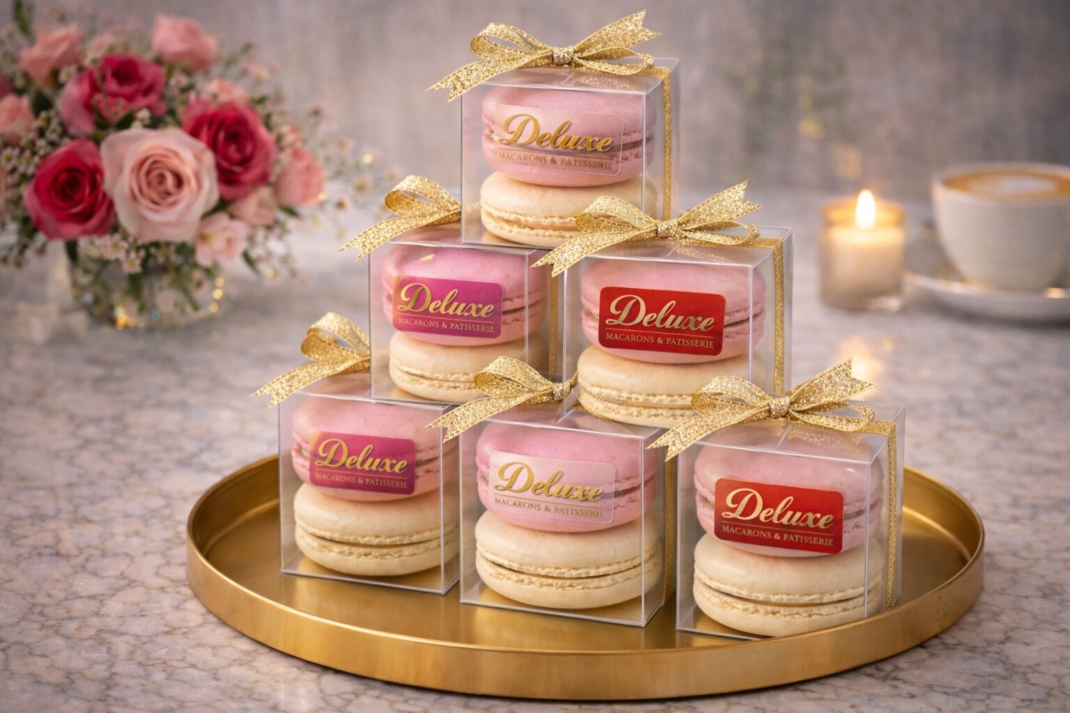Presente dans une boite transparente premium, ce coffret met en valeur deux macarons Deluxe soigneusement selectionnes. Son design sobre permet de sadapter a tous les univers, du plus festif au plus institutionnel.