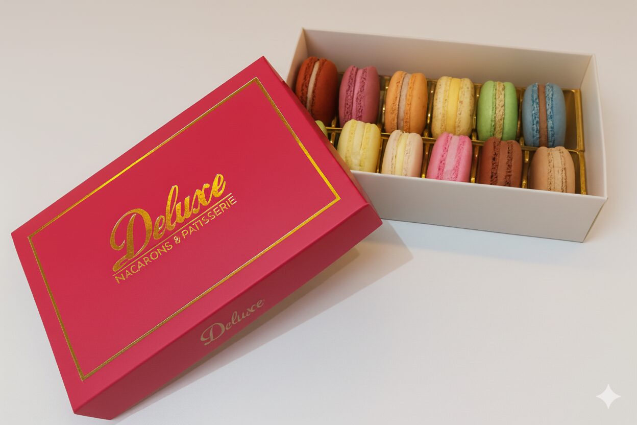 - Boite rigide signee Deluxe Macarons et Patisserie