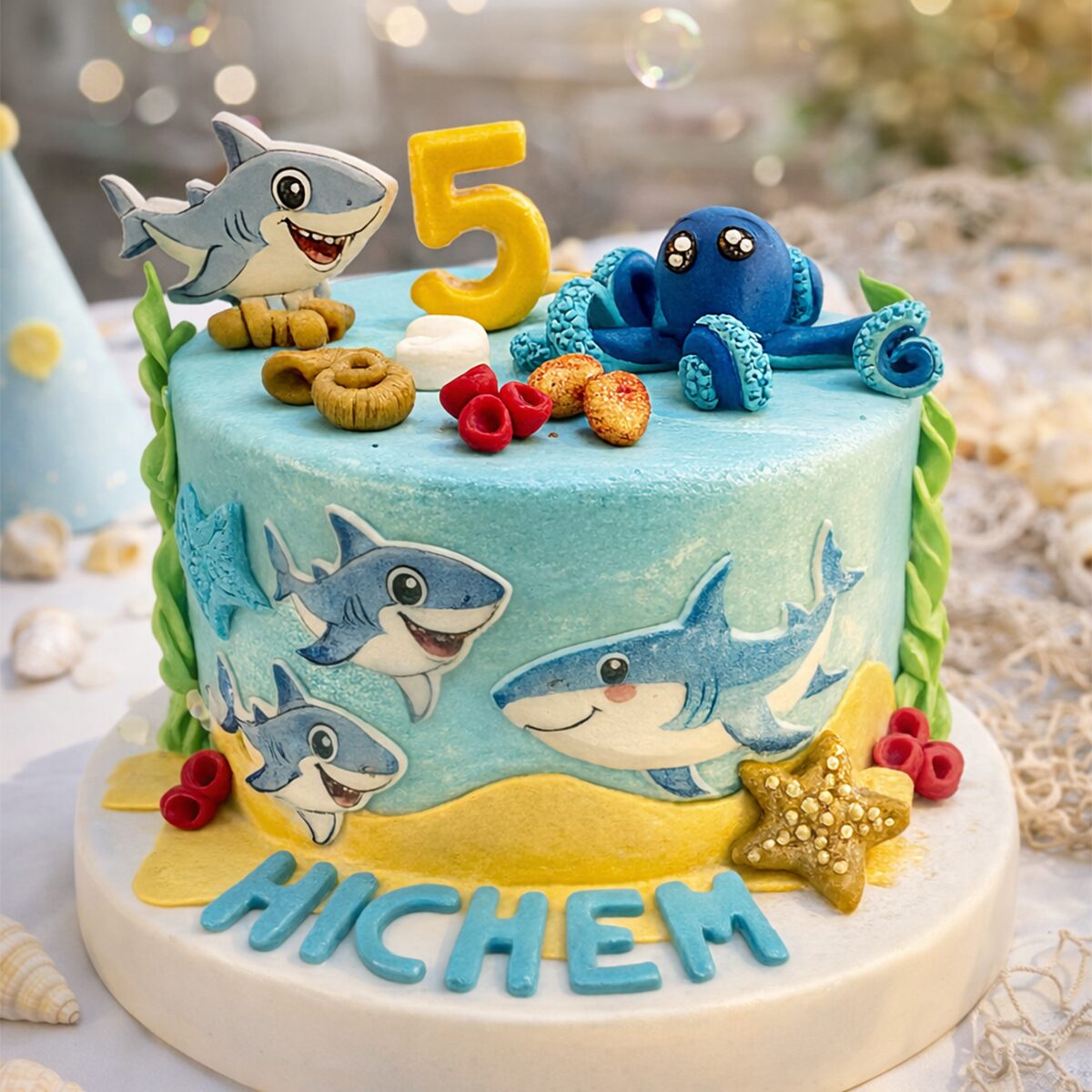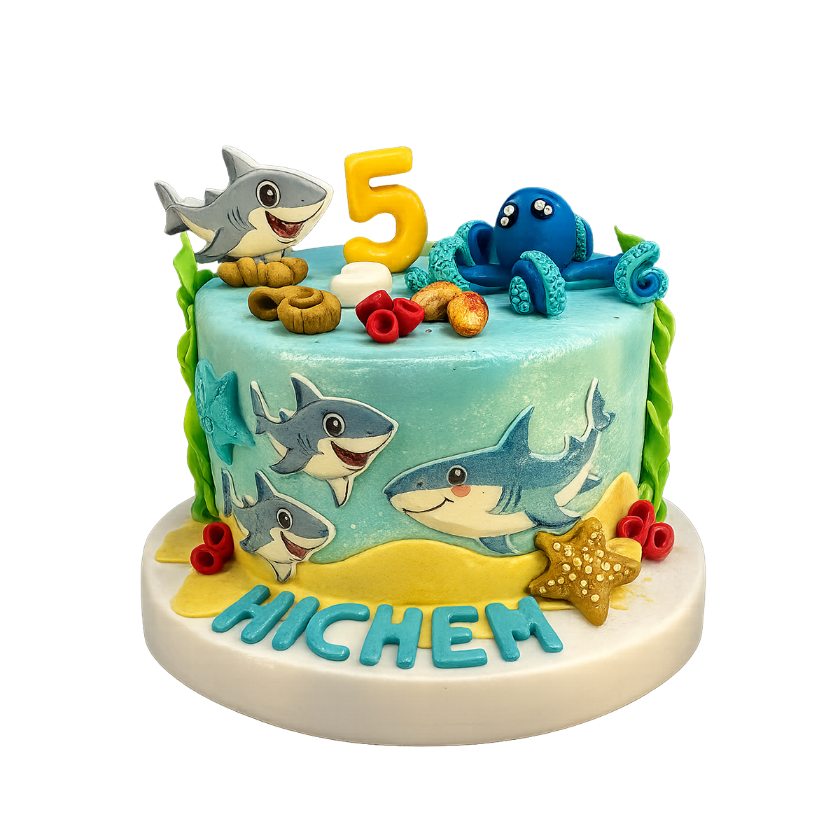 Le gateau anniversaire enfant theme marin Deluxe transporte les enfants dans un univers oceanique ludique et colore. Ce modele met en scene des requins souriants, une pieuvre en relief et des elements marins realises en pate a sucre pour un rendu spectaculaire.