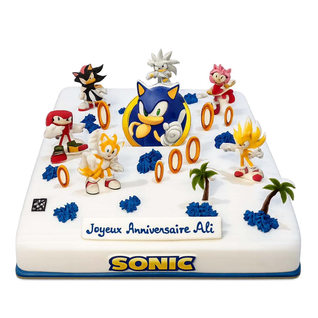 Offrez un gateau anniversaire sonic spectaculaire avec personnages et decor inspiré du jeu. Entierement personnalisable avec prenom, couleurs et theme. Ideal pour anniversaire enfant avec livraison rapide sur Tunis et Grand Tunis.