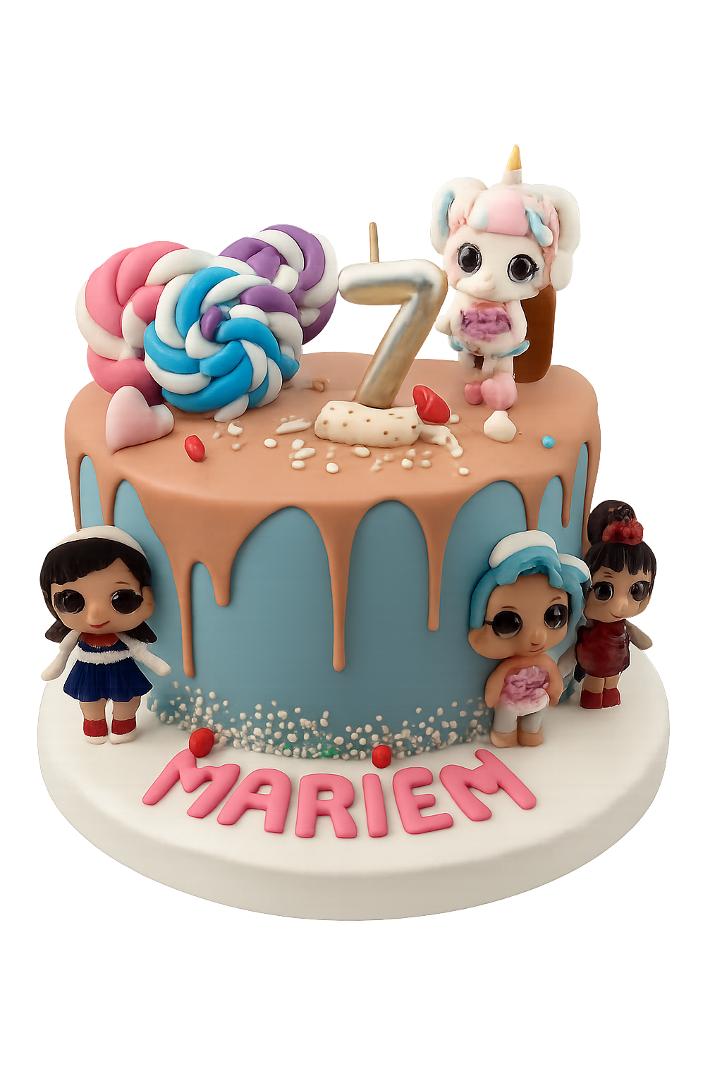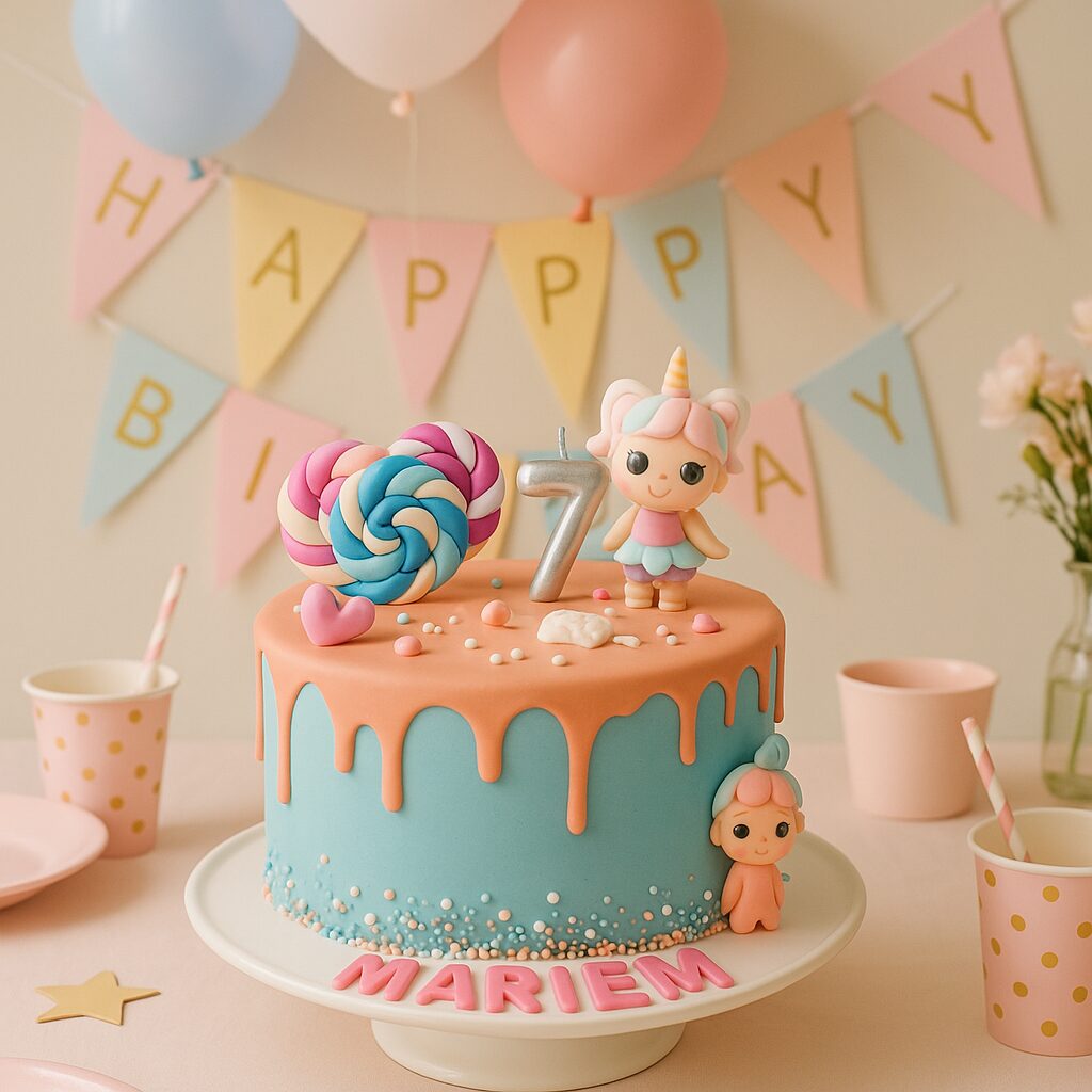 Ce gâteau d’anniversaire coloré est inspiré de l’univers des célèbres poupées LOL Surprise. Réalisé dans des tons pastel et gourmands, il combine une base bleu ciel et un glaçage coulant rose saumon pour un effet visuel ultra tendance.