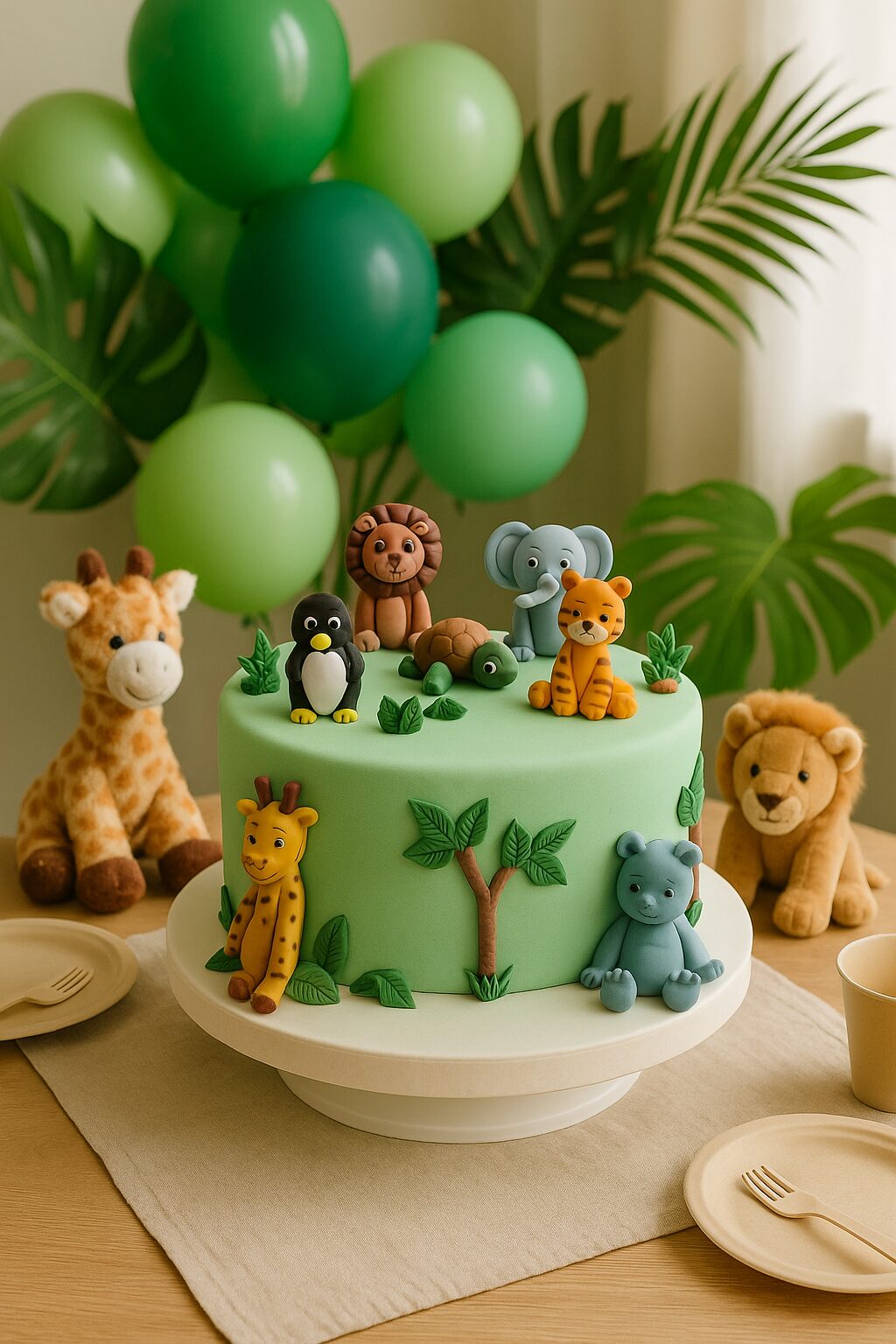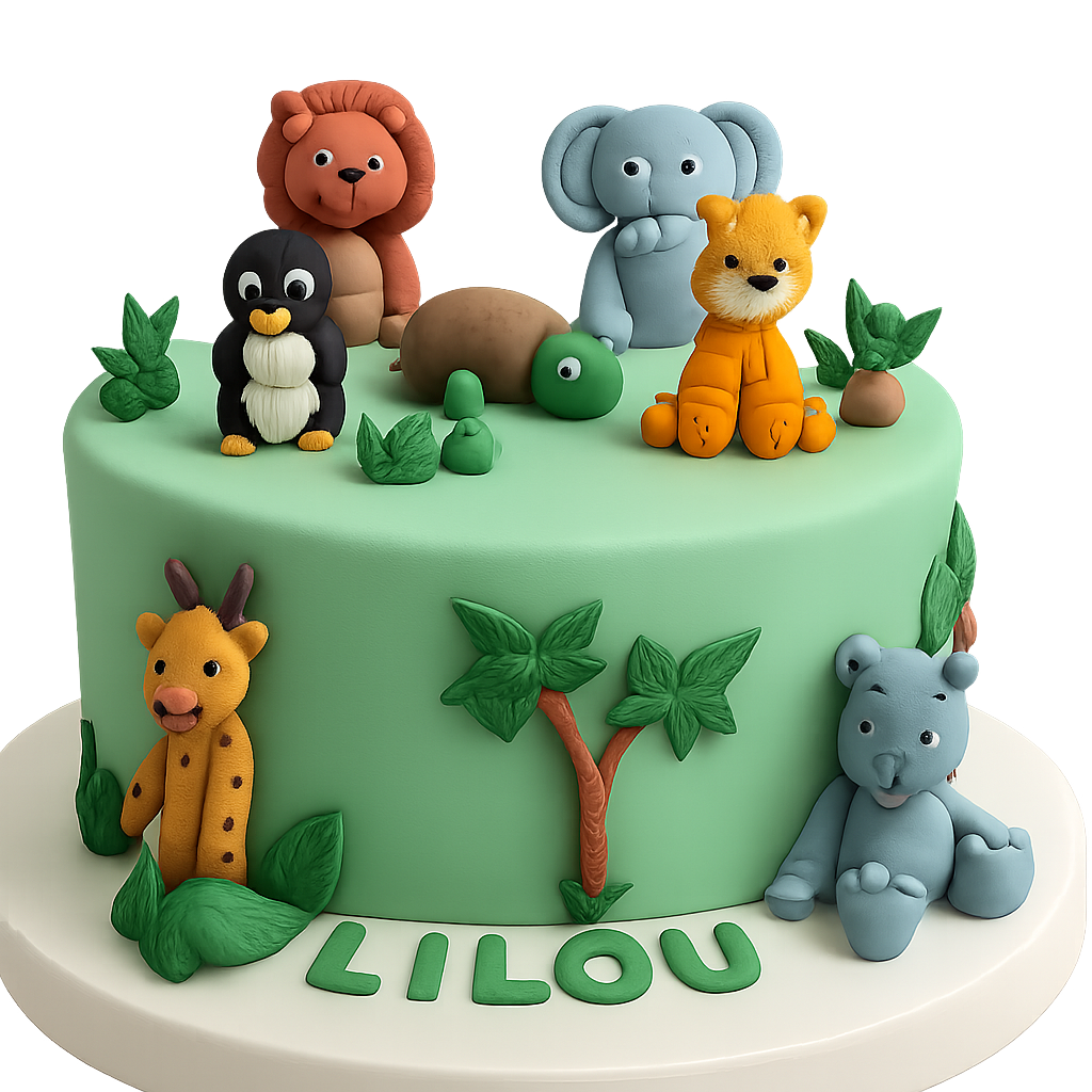 Ce magnifique gâteau d’anniversaire sur le thème de la jungle est une création gourmande et pleine de tendresse. Recouvert d’une pâte à sucre vert pastel évoquant la nature tropicale, il met en scène de charmants animaux modelés à la main : lion, tigre, éléphant, girafe, pingouin, tortue et hippopotame, chacun expressif et délicatement travaillé.