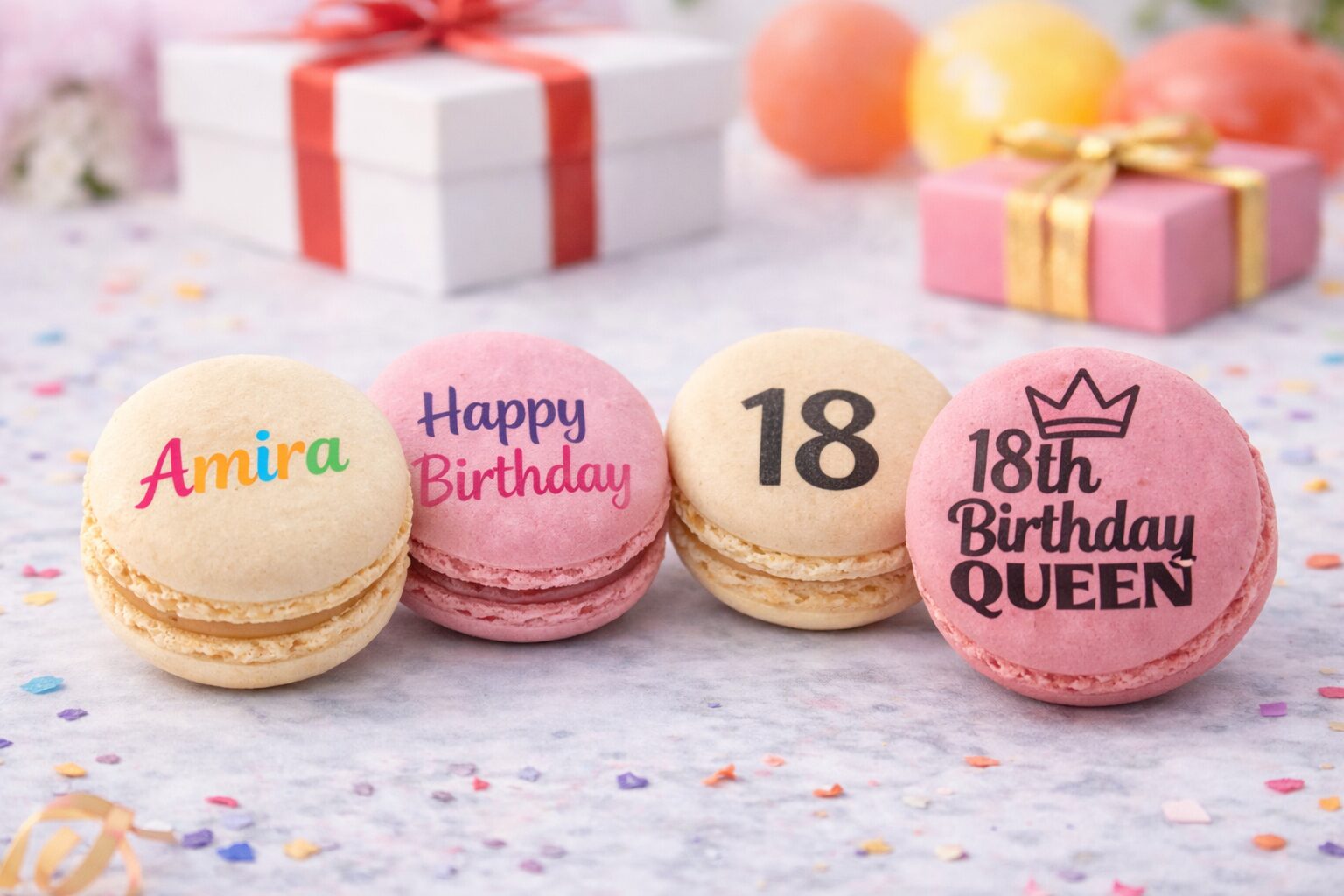 Offrez une attention inoubliable avec nos macarons personnalisés spécial anniversaire. Message, prénom, âge ou petit mot tendre… chaque macaron devient une surprise gourmande et sur mesure, parfaite pour toutes les générations !