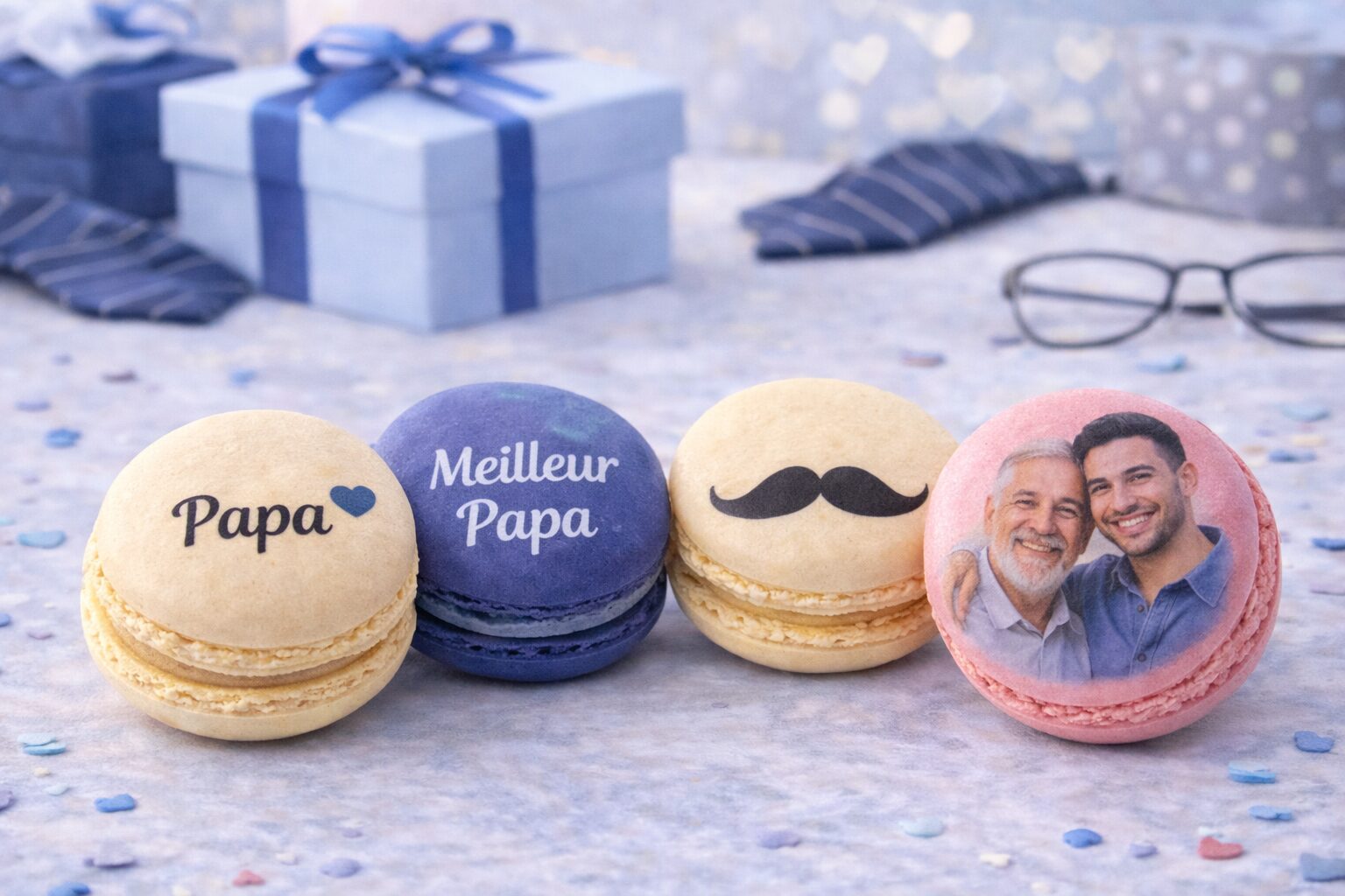 Offrez un moment de douceur et de reconnaissance avec nos macarons personnalisés pour la fête des pères. Chaque macaron peut être imprimé avec un petit mot, un prénom, ou des symboles comme une moustache ou un cœur, dans des couleurs comestibles. Présentés en coffret élégant ou en pyramide, ils constituent un cadeau original, personnel et 100 % gourmand.